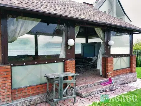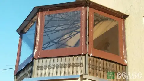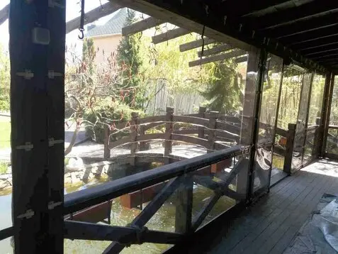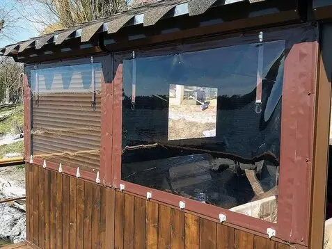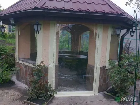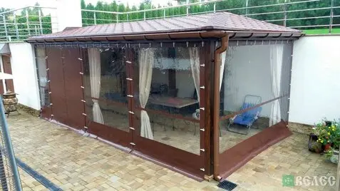 Беседка с прозрачными окнами. Вверху и по бокам шторы закрепили саморезом, внизу поставили "скоба+люверс с ремешком". По бокам - змейки , чтобы шторы можно было открывать и заворачивать наверх. Наверху поставлены ремешки с карабинчиками для удержания рулона в свернутом состоянии.