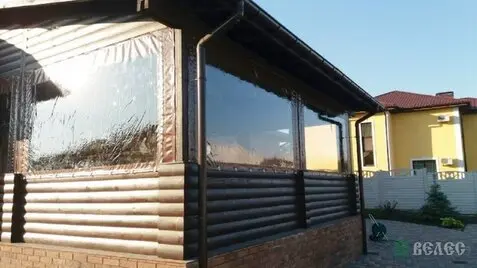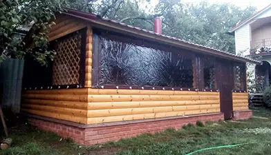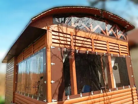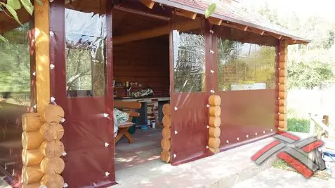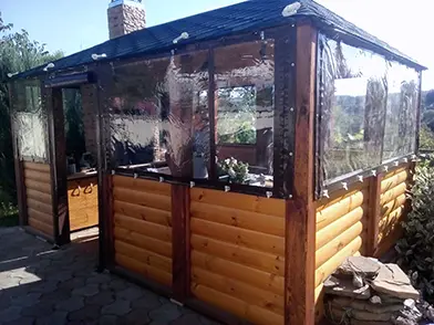 Беседка из бруса для кафе с прозрачными ПВХ шторами - отличное недорогое решение для защиты посетителей от непогоды.