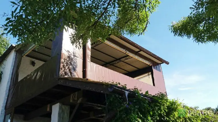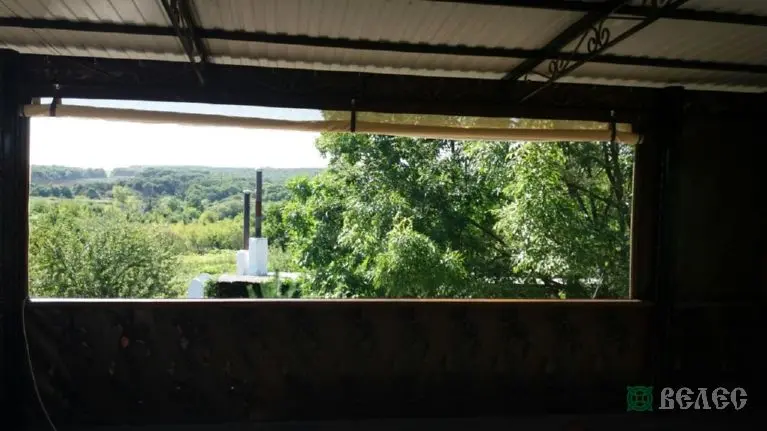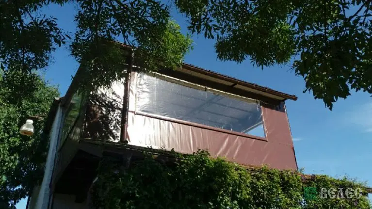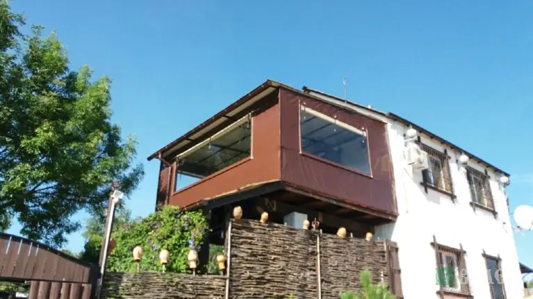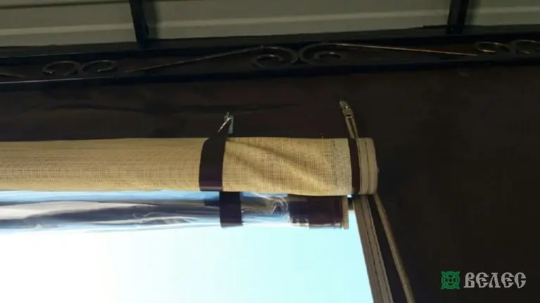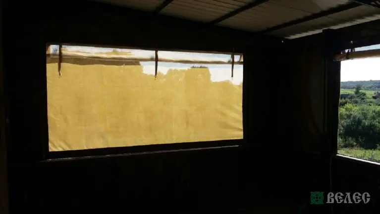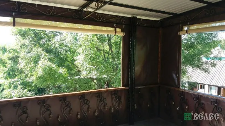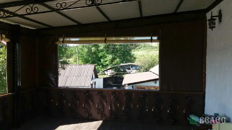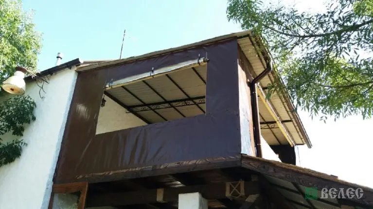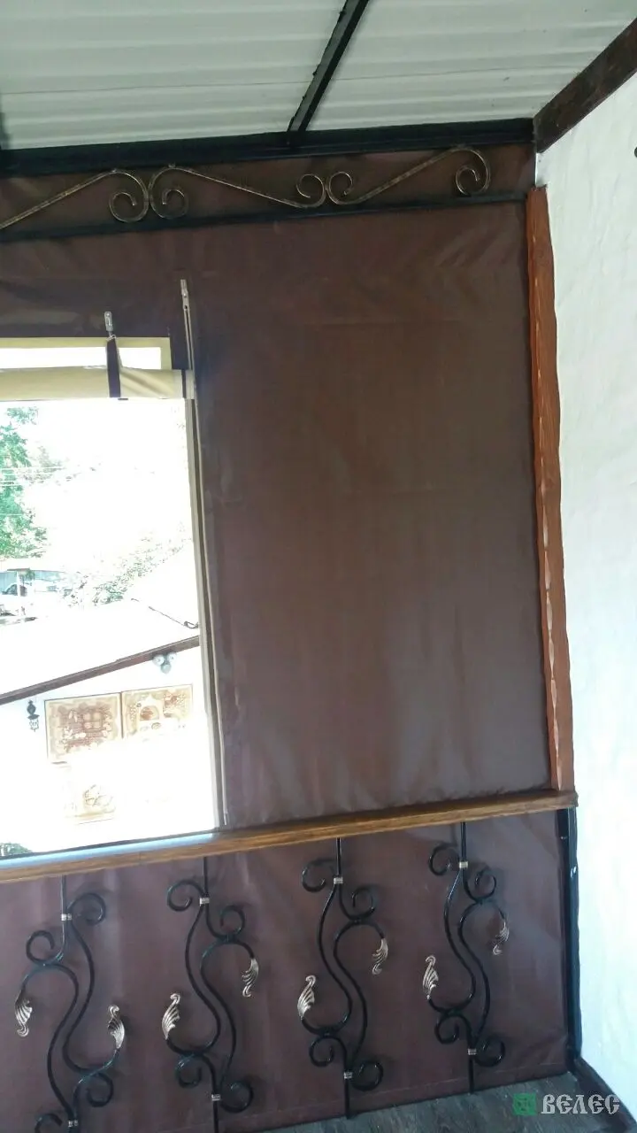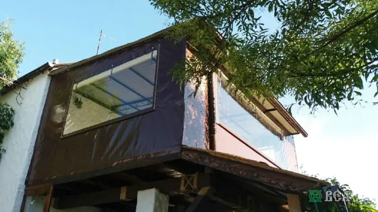 Веранда с мягкими окнами ПВХ и шторами из москитки.