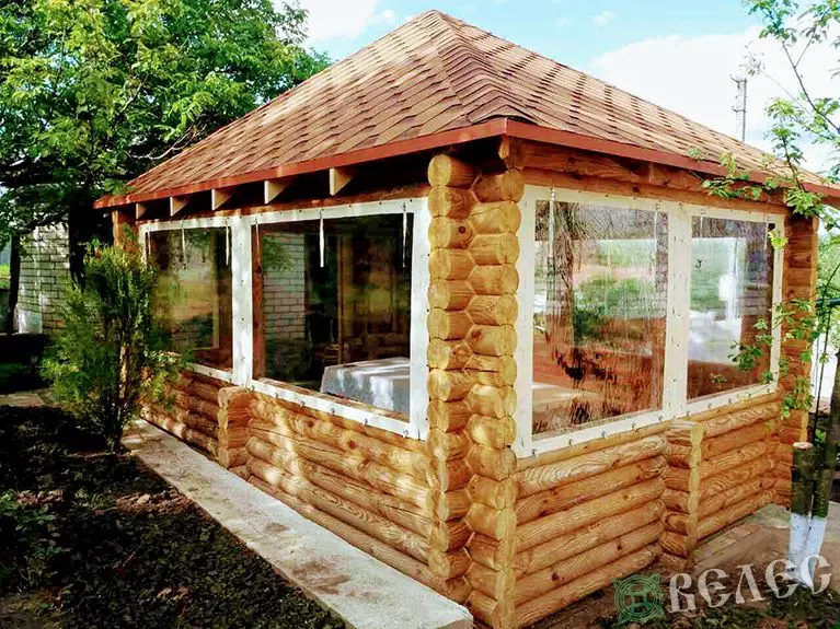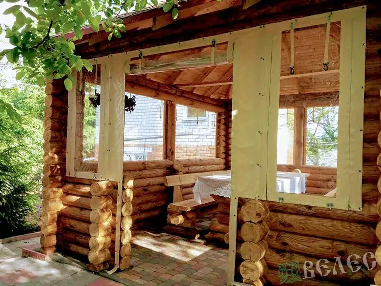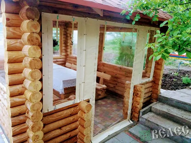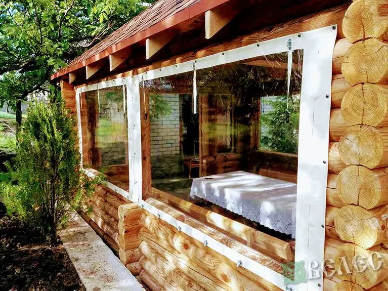 Шторы ПВХ из прозрачной пленки на беседку из бруса.
