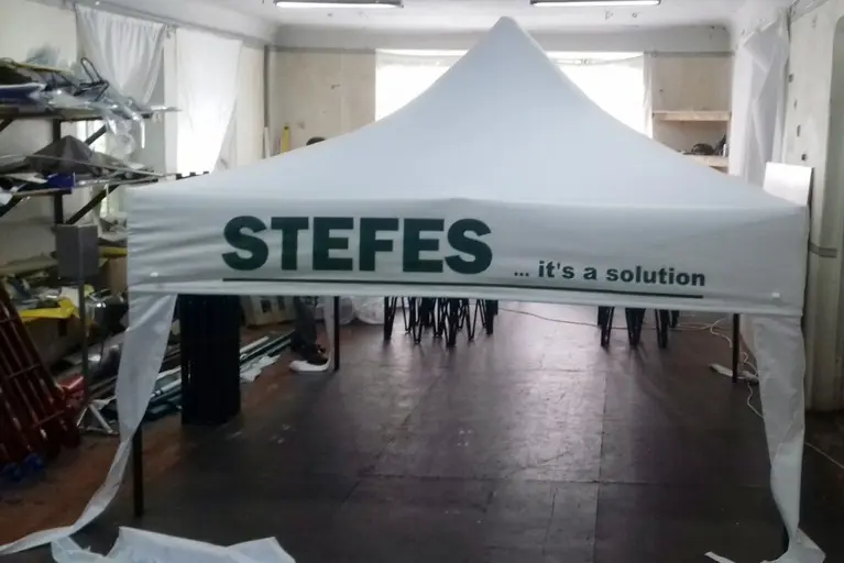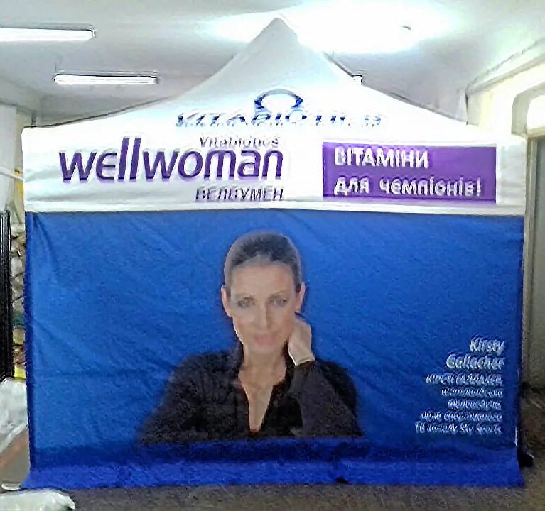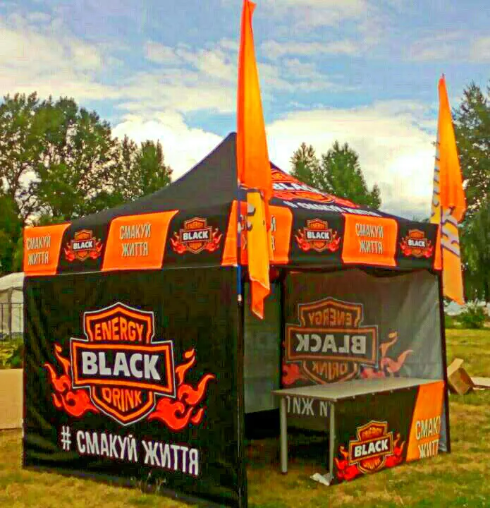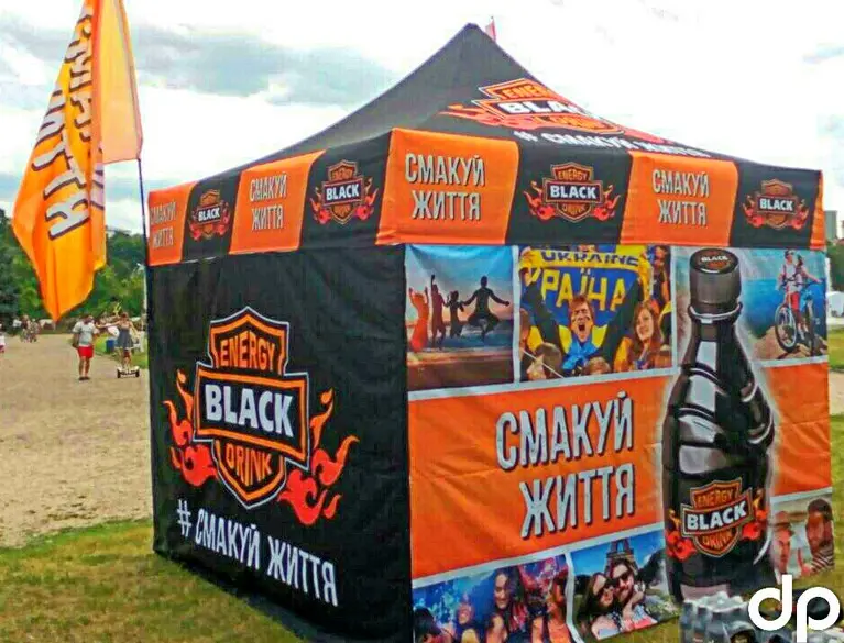Рекламные изображения в раздвижных шатрах наносят на : скаты крыши, рюши, боковые стенки.