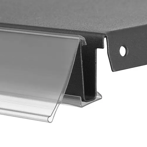 • Профильные ценникодержатели: они монтируются на профиль полки с использованием специальной защелки, обеспечивающей надежное крепление и легкость демонтажа.