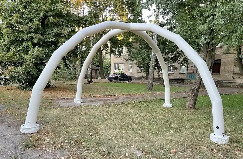 пневмокаркасная конструкция– организована с помощью каркаса из надувных баллонов на которой натянут тент. (надувается каркас и с помощью утяжелителей и дополнительных крепежей фиксируется к земле, а потом накидывается тент, на который можно нанести логотип). Бывают трех, четырех, пяти, шести, восьми опорные.