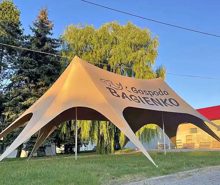 Тент "Звезда" обладает уникальной формой. Его покрытие, имеющее от 5 до 9 "лучей", натягивается на одну или несколько высоких опор. затем тент закрепляется за землю или другую стабильную основу с помощью ремней и крюков. Взглянув сверху на такую структуру, можно увидеть купол с длинными лучами.