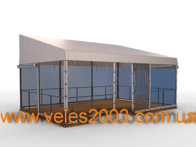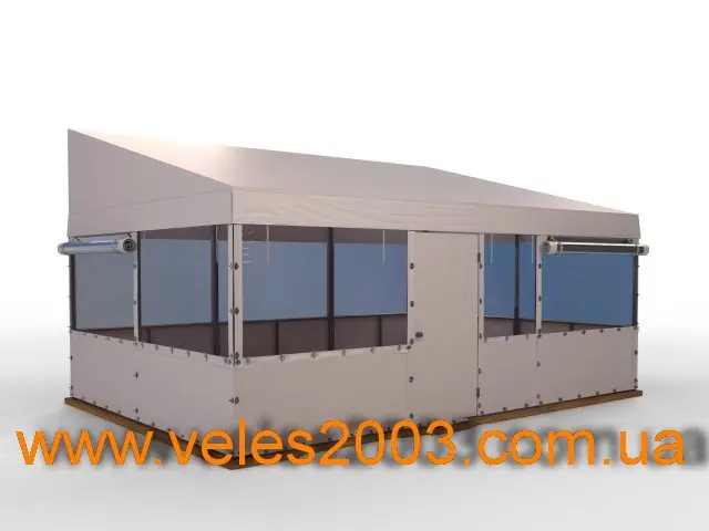 Комплектность - каркас,тент крыши, летние тентовые заборы с рекламой, тентовые стены, металлопластиковая дверь.