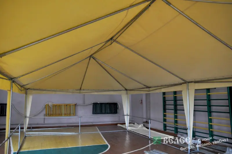 ПВХ павильон 5х10 м | 40000 грн | Каркас из профильной трубы 30х30мм и 25х25мм (покраска грунт) - ферменные конструкции | Тент - ПВХ ткань плотностью 630-650 грам/квм (Корея) | В комплекте 4 шт. съемные боковые стенки (без окон) | Форма крыши "растянутая пирамида" |